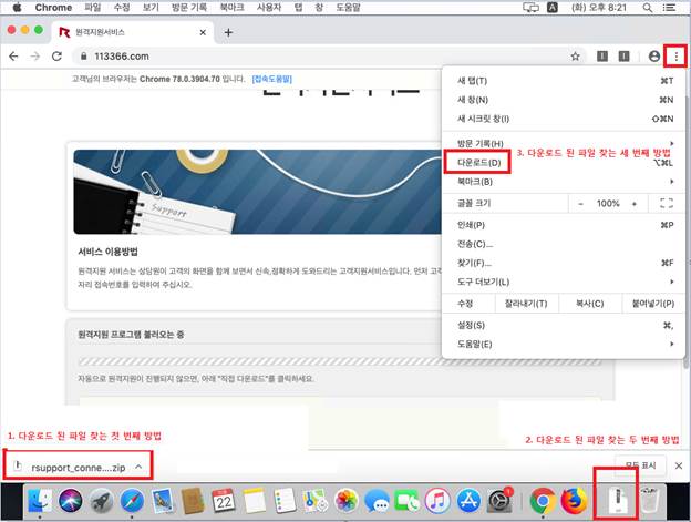 크롬 작업표시줄에 rsupport_connet5.zip 파일이 다운로드 된다. 해당파일을 클릭해준다.