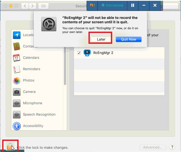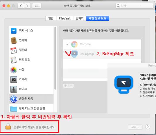 6. 좌물쇠를 클릭 하여 비번 입력 후 RcEngMgr 체크를 하고 설정창은 닫는다.
