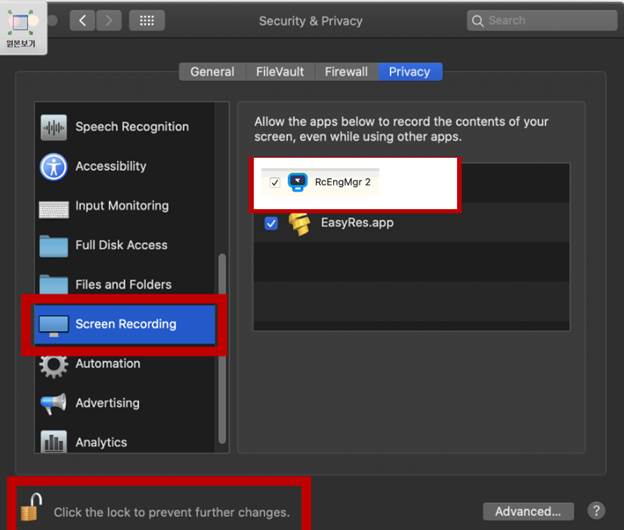카탈리나 os : [ 화면 기록 권한 설정 ] 클릭하면 5번 이미지의 권한 설정변경 할 수 있는 창이 자동으로 나옴
