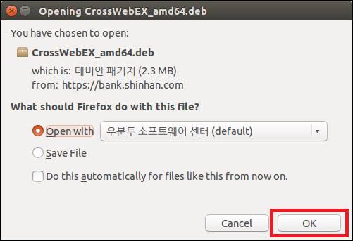 2. 설치파일 다운로드 후 우분투 소프트웨어 센터를 사용하여 열도록 설정한 후 【OK】버튼을 선택하여 다운로드를 시작합니다.