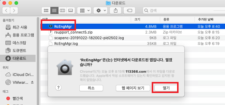 클릭하면 자동 압축해제 되면서 안에 RcEngMgr 파일이 보임. 해당파일 클릭 후 열기를 다시 클릭.